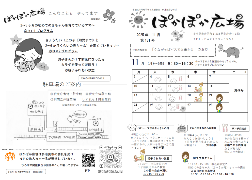 地域子育て支援の拠点として平成27年1月5日、多治見市駅北庁舎3階に、「ぽかぽか広場」がスタートしました。0歳からおおむね3歳の未就園児とその保護者、妊婦およびそのパートナーを対象とした室内の遊び場です。遊具や絵本などで遊んだり、親同士の交流の場として利用できます。常駐する職員が育児の相談に応じたり、子育ての情報の提供や企画行事なども行います。